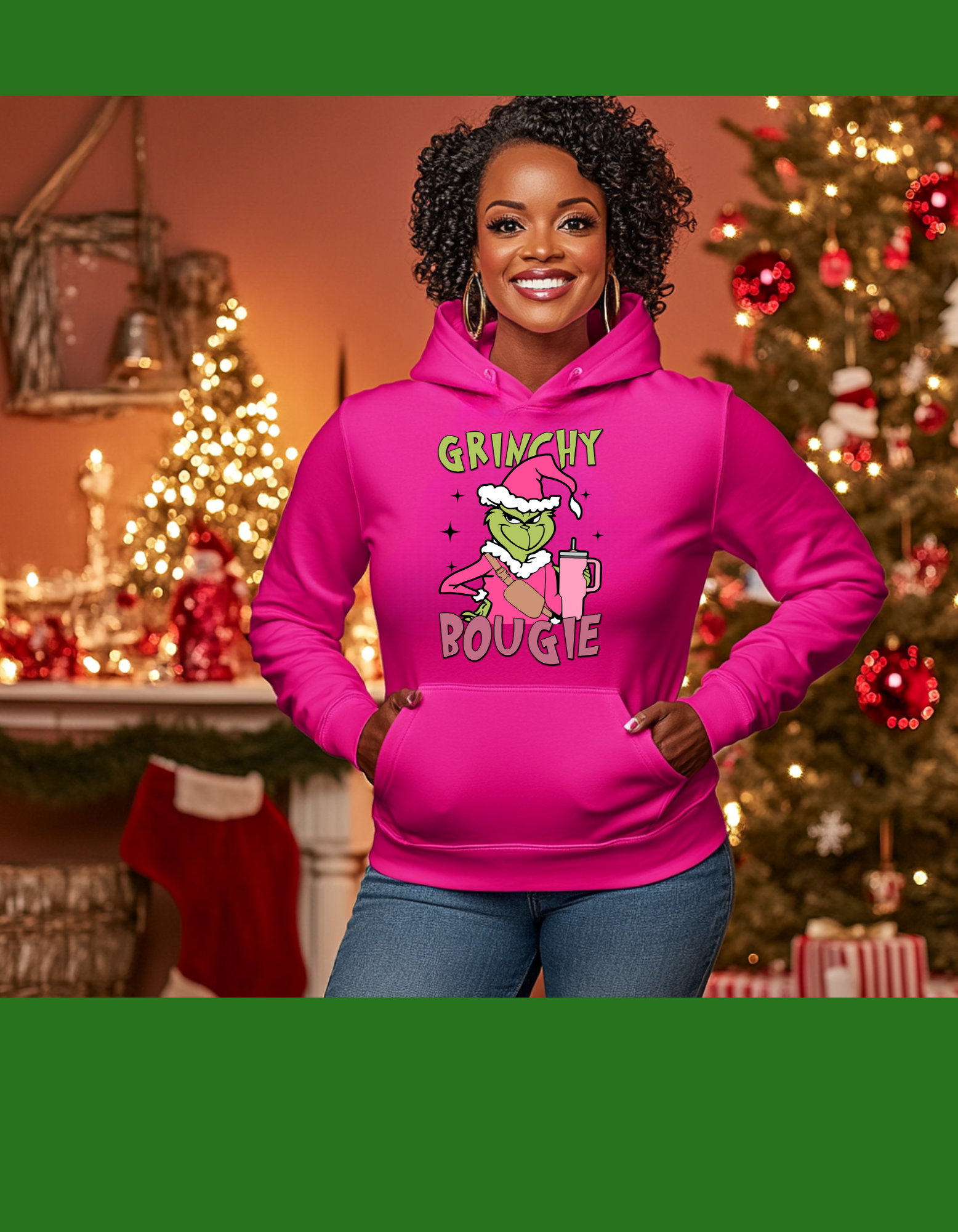 Stay cozy and stylish this holiday season with our Grinchy and Bougie hoodie a mixture of 'tude and seasonal charm. Perfect for anyone who loves Christmas combined with comfort and a bold style, making it the ultimate go-to for holiday gatherings, shopping trips, or lounging at home.