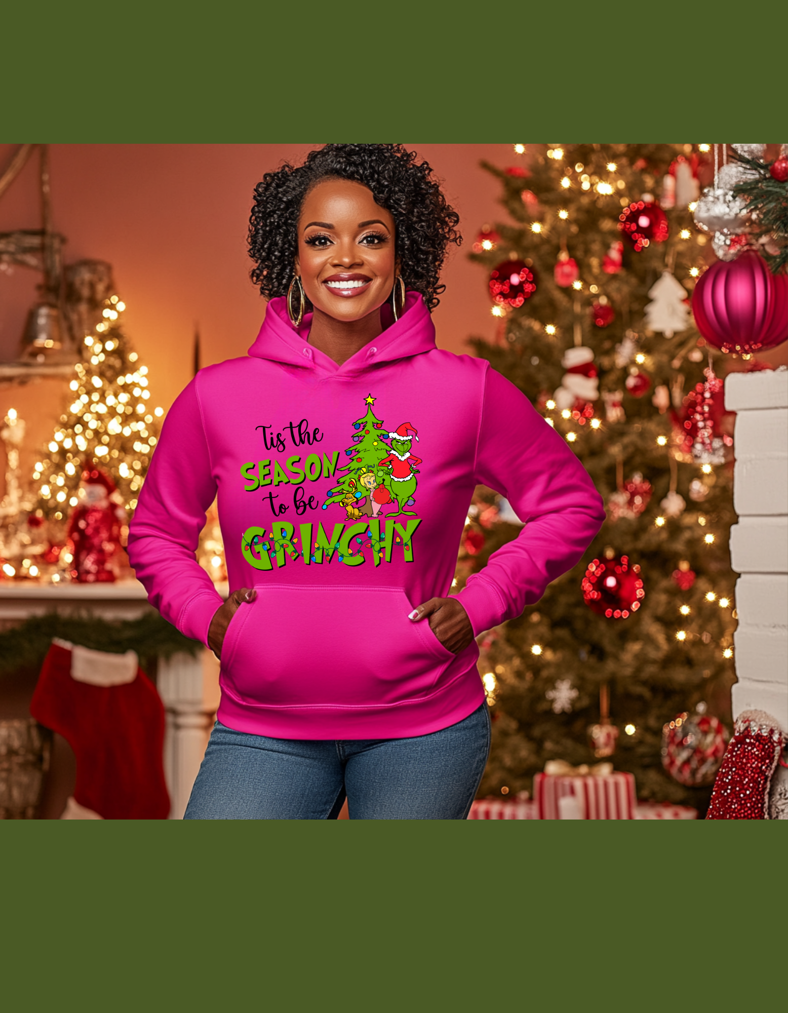 Stay cozy and stylish this holiday season with our Tis the Season to be Grinchy hoodie a mixture of 'tude and seasonal charm. Perfect for anyone who loves Christmas combined with comfort and a bold style, making it the ultimate go-to for holiday gatherings, shopping trips, or lounging at home.