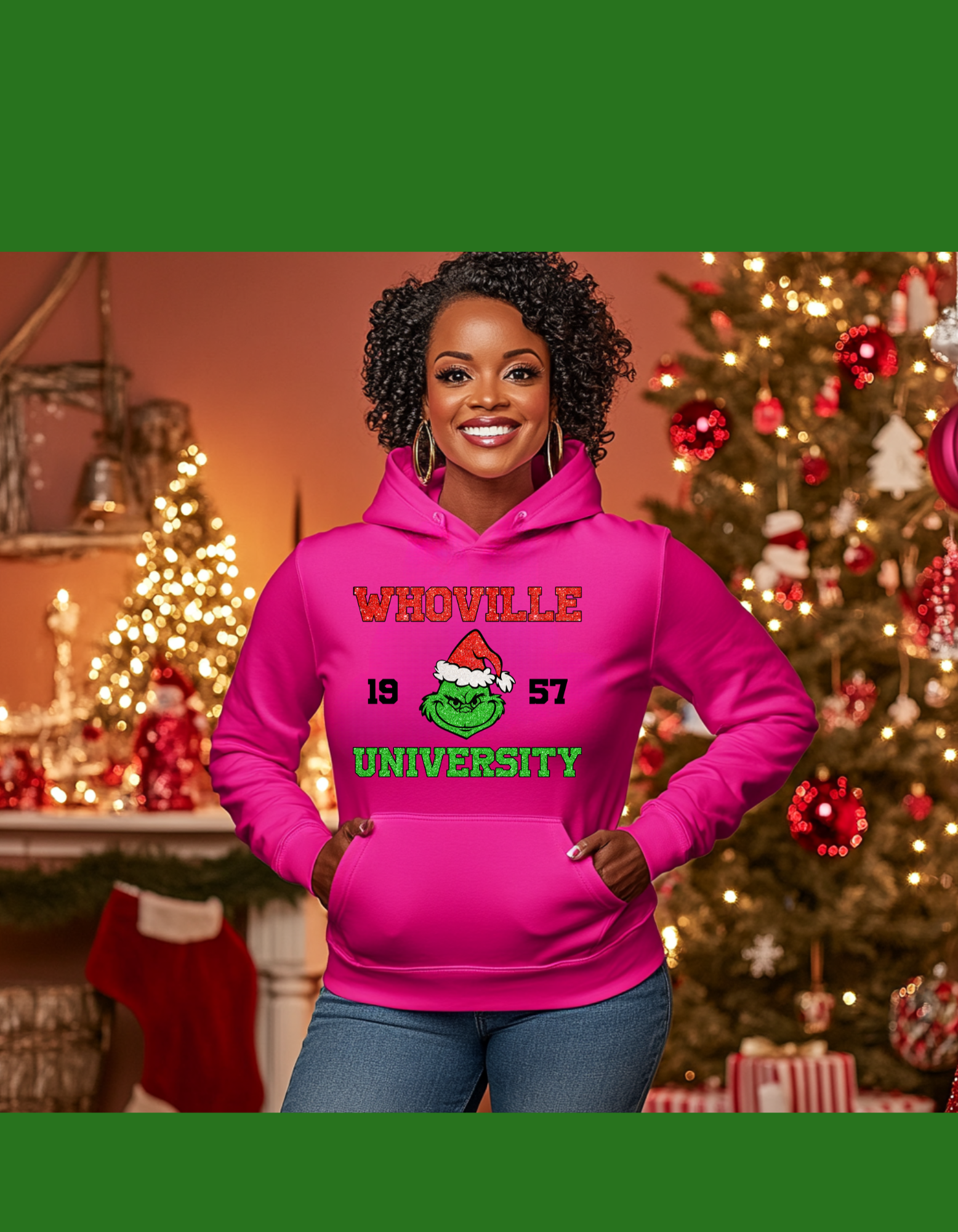 Stay cozy and stylish this holiday season with our Whoville University 1957 hoodie a mixture of 'tude and seasonal charm. Perfect for anyone who loves Christmas combined with comfort and a bold style, making it the ultimate go-to for holiday gatherings, shopping trips, or lounging at home.